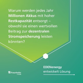 Jährlich werden Millionen E-Bike- und E-Scooter-Akkus bereits bei 70–80 % Restkapazität ausrangiert – ein enormes ungenutztes Potenzial. Gleichzeitig wächst der Bedarf an sicheren, nachhaltigen und bezahlbaren Stromspeichern. EDENenergy verbindet genau diese beiden Welten und entwickelt modulare Second-Life-Speicher, die dank Mikro-Wandlern und KI-basiertem Energiemanagement besonders effizient, sicher und langlebig sind. EDENenergy ist ein Ausgründungsprojekt aus dem Fraunhofer ISE.