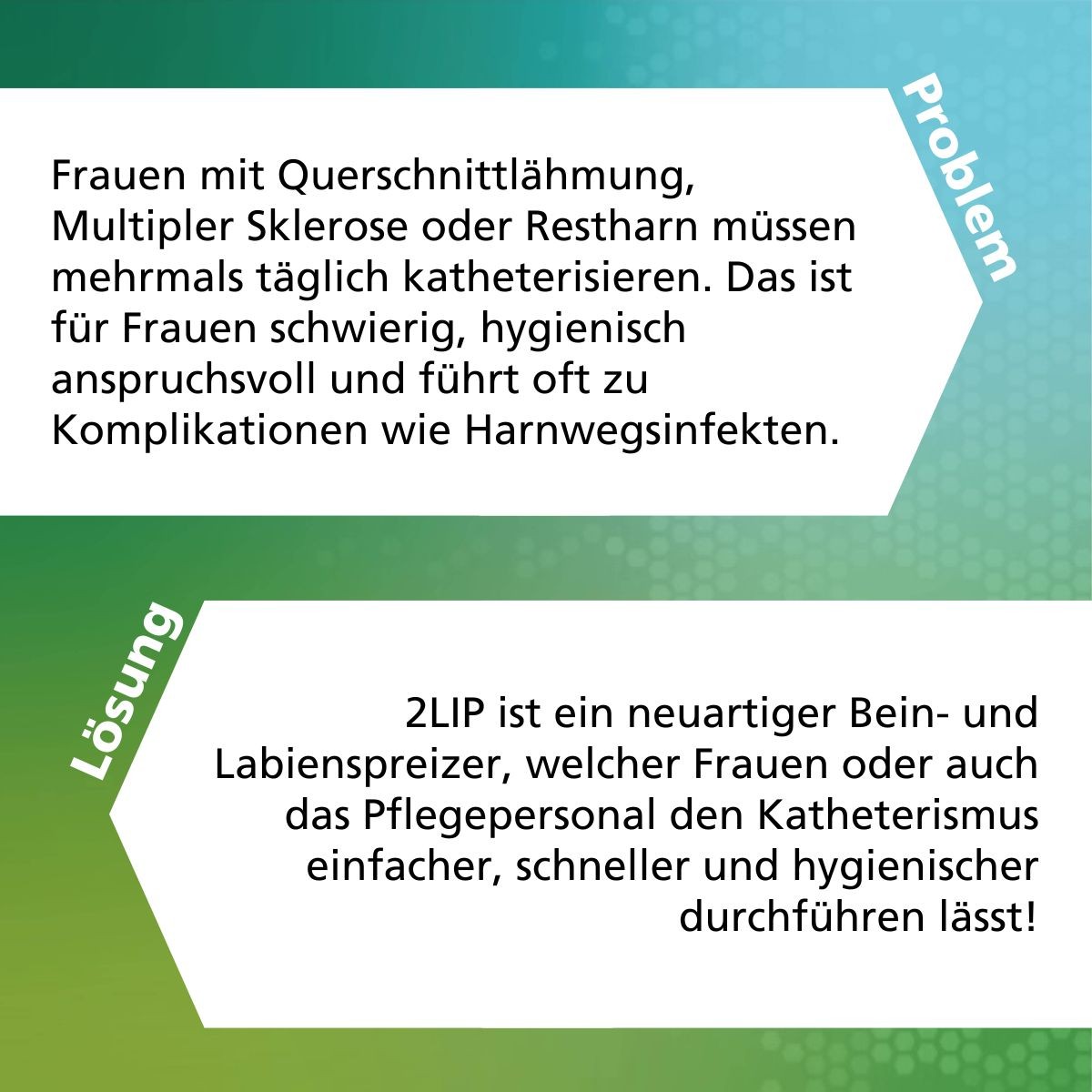 Mehr Selbstbestimmung für Frauen mit Querschnittlähmung, Multipler Sklerose oder Restharn: 2LIP ist eine innovative Lösung, die das Katheterisieren einfacher, hygienischer und sicherer macht. Mit minimaler Spreizung, freiem Blick und zwei freien Händen schafft 2LIP Komfort und reduziert Komplikationen wie Infektionen.