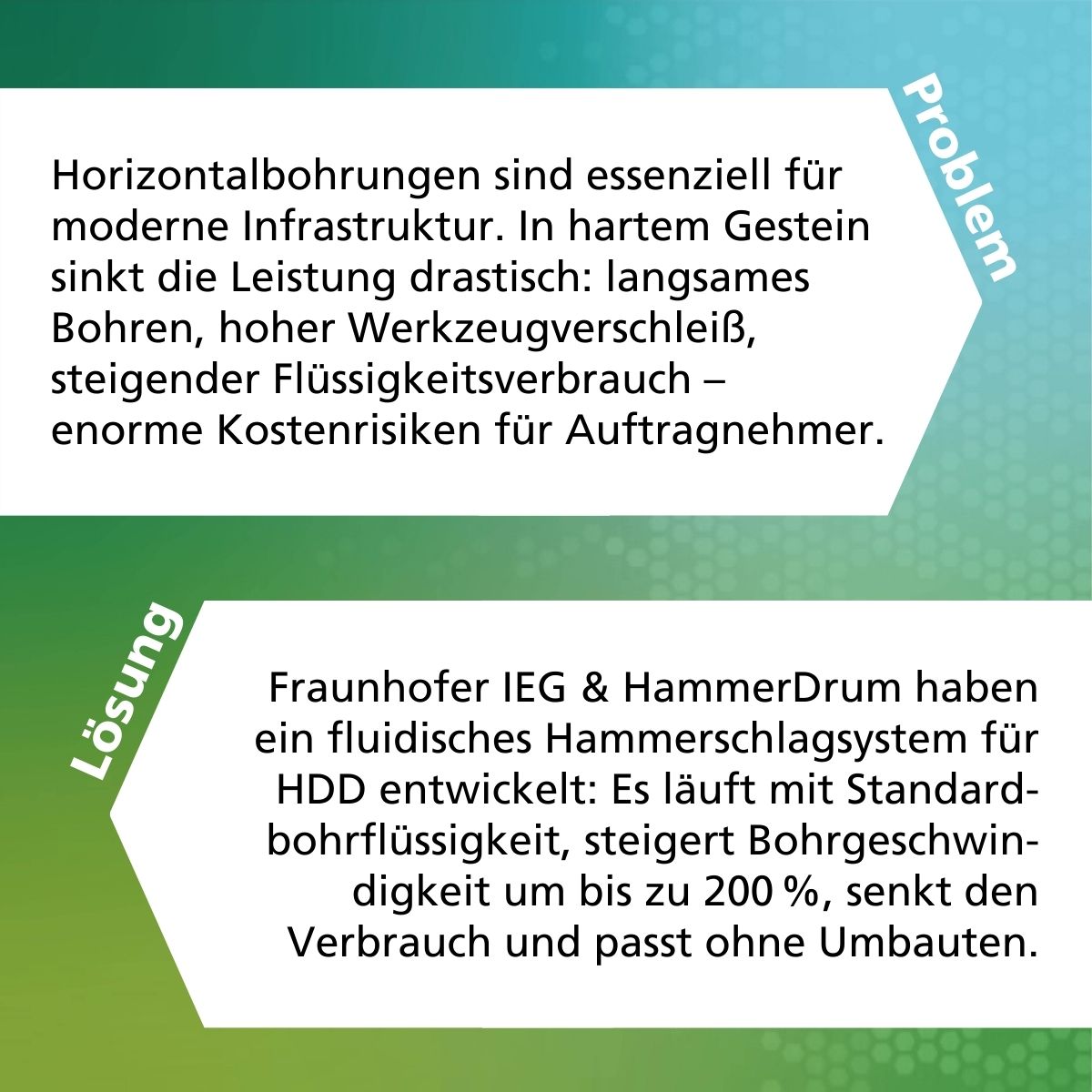HammerDrum revolutioniert HDD: Das fluidische Hammerschlagsystem steigert die Bohrgeschwindigkeit in hartem Gestein um bis zu 200 %, senkt den Flüssigkeitsverbrauch und integriert sich ohne Umbauten in bestehende Rigs. Das bedeutet schnellere, planbare und profitablere Projekte für Auftragnehmer.