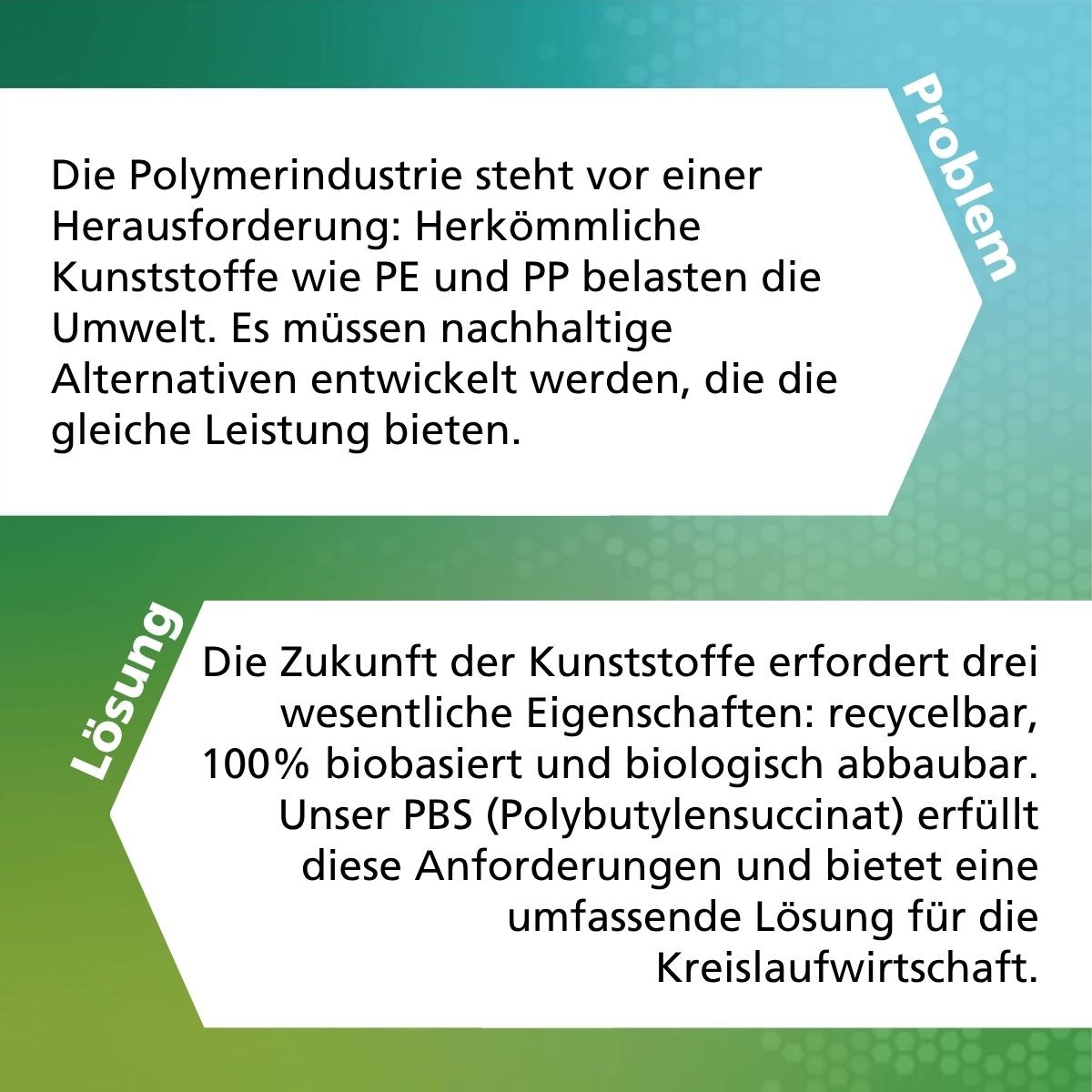 Die Polymerindustrie steht vor einer Herausforderung: Herkömmliche Kunststoffe wie PE und PP stammen aus fossilen Brennstoffen und belasten die Umwelt. Es werden nachhaltige Alternativen benötigt, die recycelbar, 100% biobasiert und biologisch abbaubar sind. PBS (Polybutylensuccinat) erfüllt diese Anforderungen und bietet eine umfassende Lösung für die Kreislaufwirtschaft. PBS ist recycelbar, stammt aus erneuerbaren Ressourcen und hat verbesserte Fließeigenschaften.