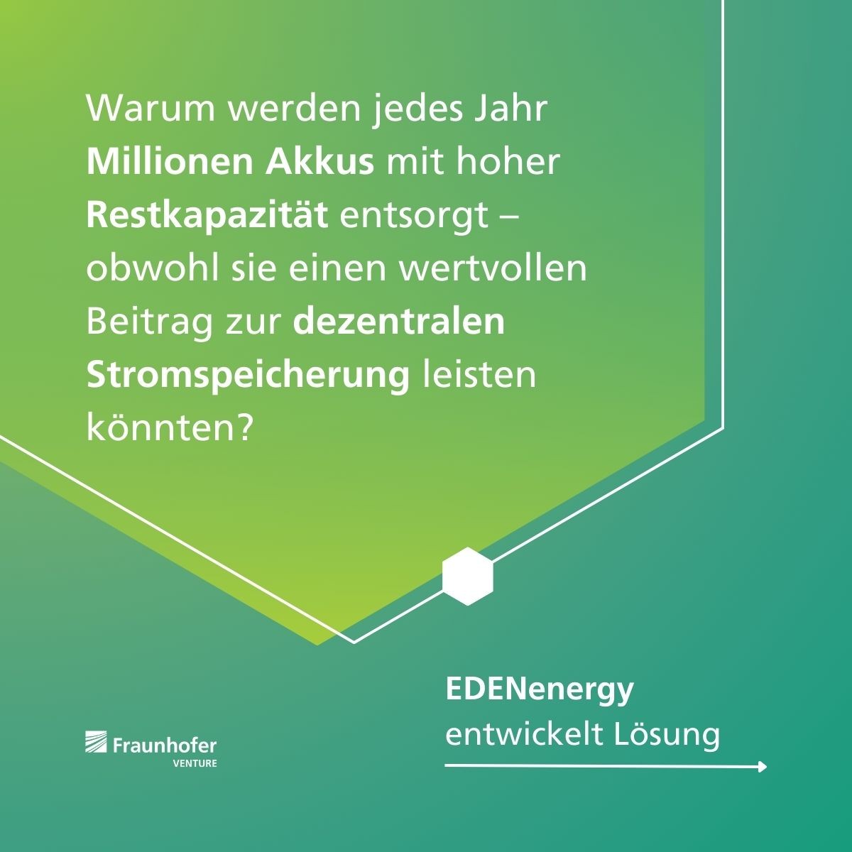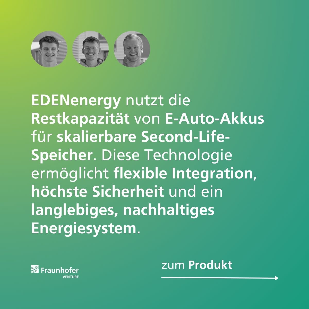 Jährlich werden Millionen E-Bike- und E-Scooter-Akkus bereits bei 70–80 % Restkapazität ausrangiert – ein enormes ungenutztes Potenzial. Gleichzeitig wächst der Bedarf an sicheren, nachhaltigen und bezahlbaren Stromspeichern. EDENenergy verbindet genau diese beiden Welten und entwickelt modulare Second-Life-Speicher, die dank Mikro-Wandlern und KI-basiertem Energiemanagement besonders effizient, sicher und langlebig sind. EDENenergy ist ein Ausgründungsprojekt aus dem Fraunhofer ISE.